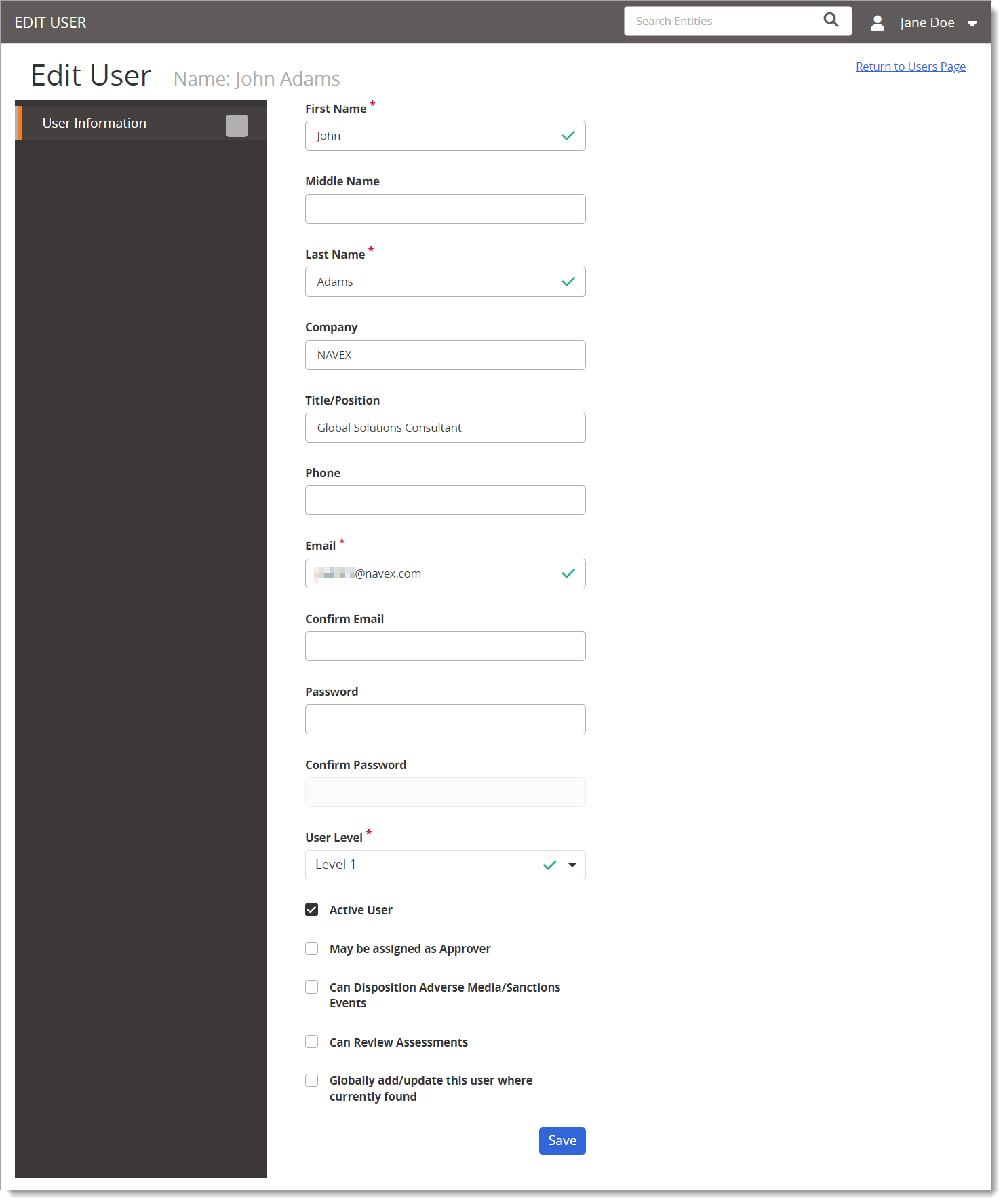 - Select the Globally add/update this user where currently found check box to also update the user's NAVEX One platform profile.