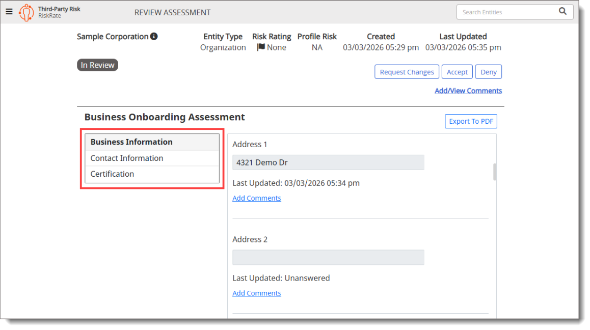 Use this option to deny the data provided in the assessment. Selecting Deny updates the assessment status to Denied and notifies the submitter, who will see your feedback. No Third Party record will be created.